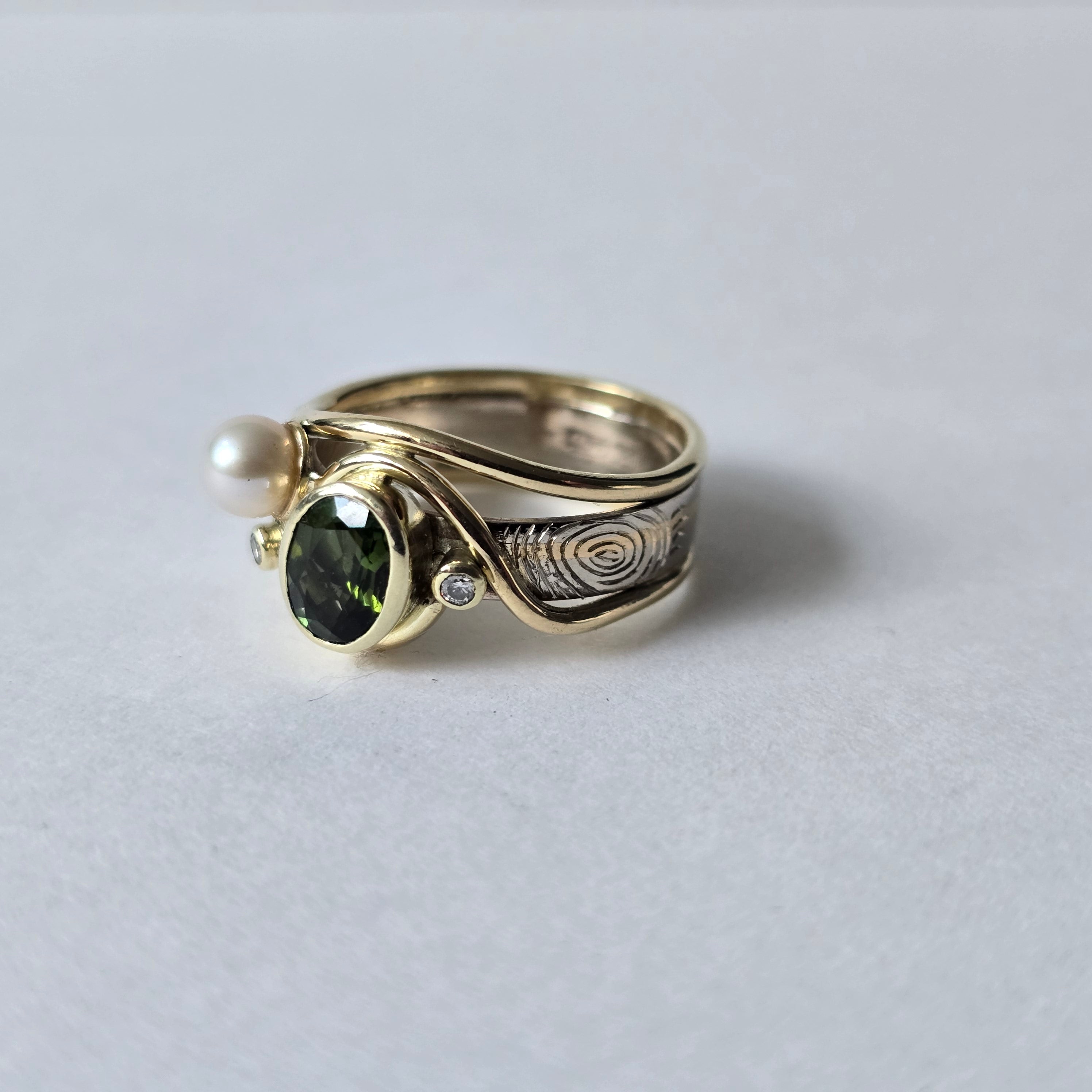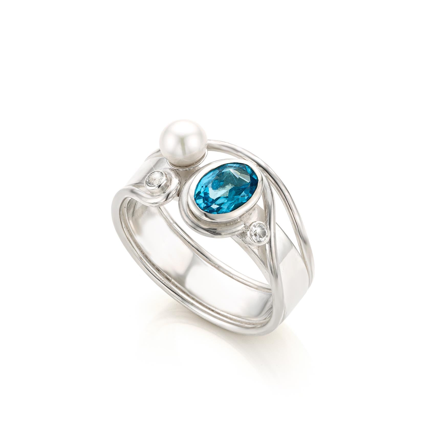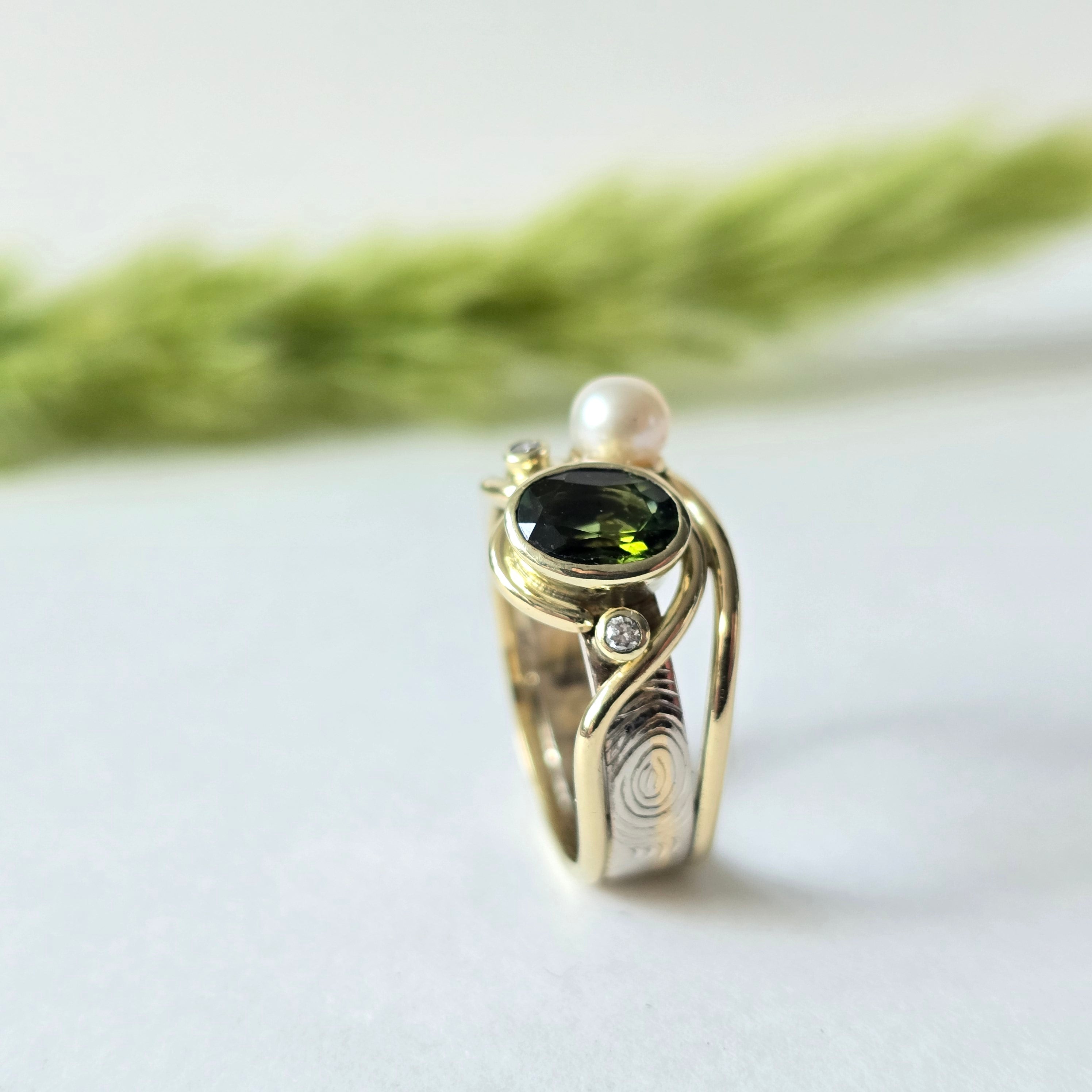 In het midden schittert een ovale steen die het hart van de ring vormt, de parel en de twee kleine steentjes aan beide kanten maken de ring speels in balans en geven het ontwerp een zachte uitstraling.