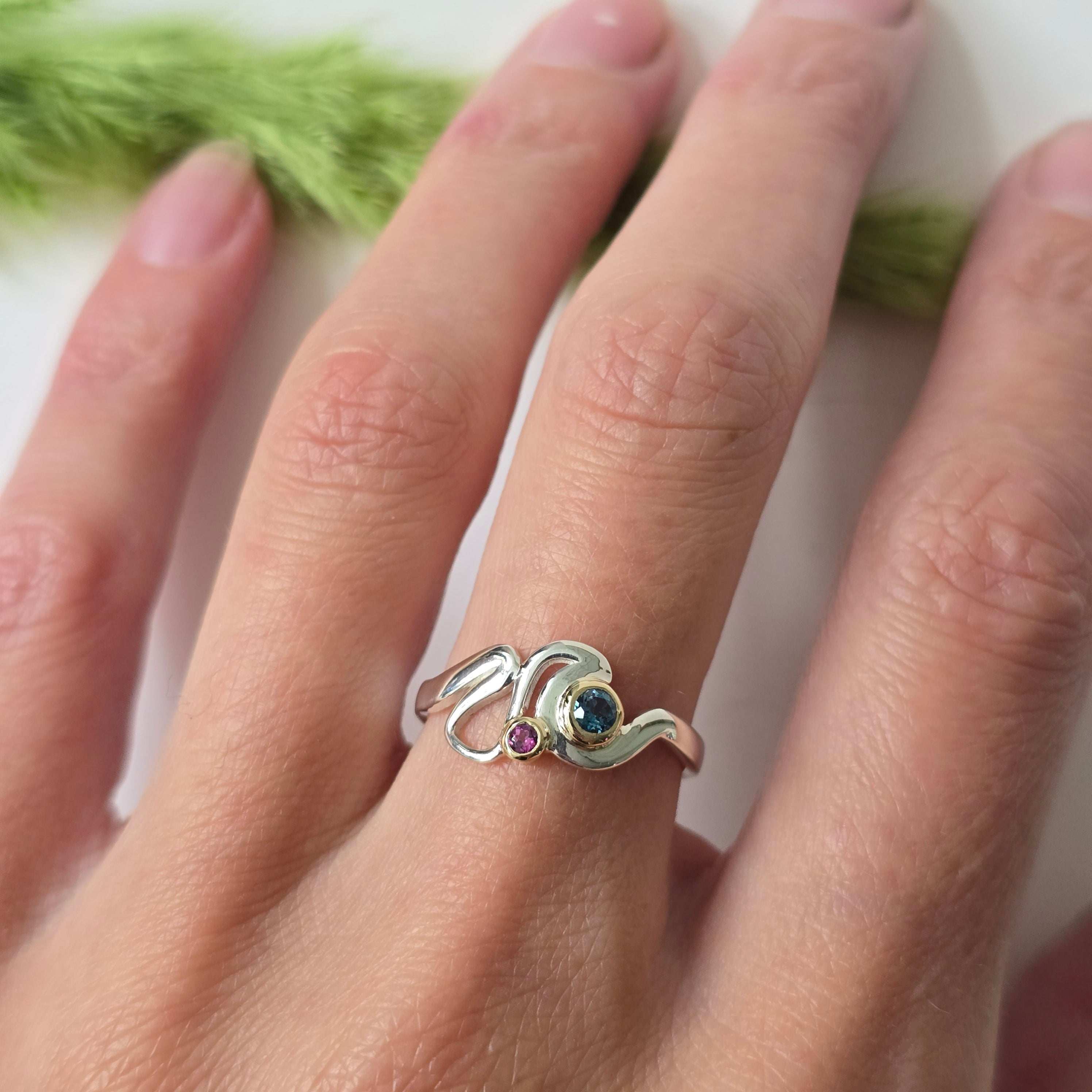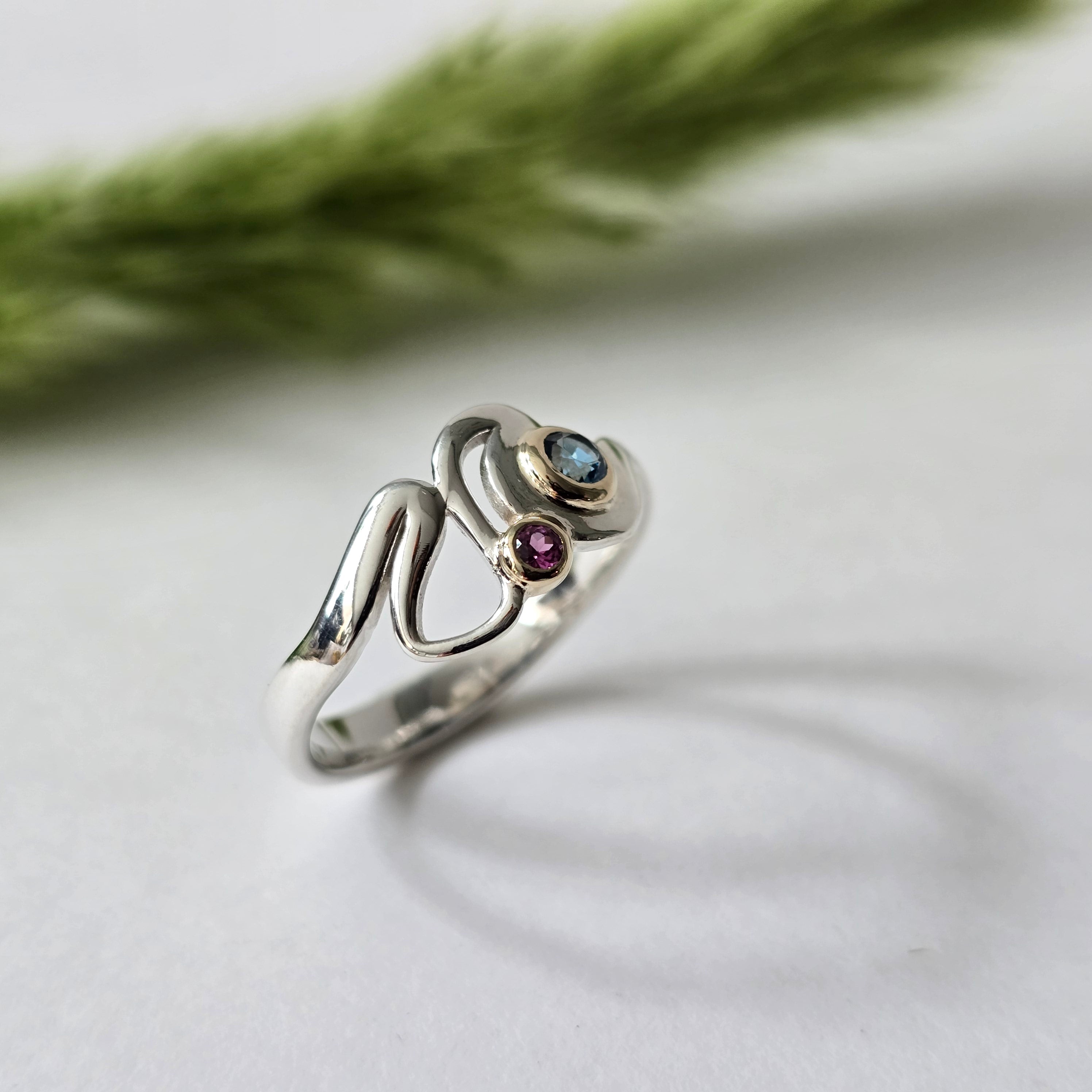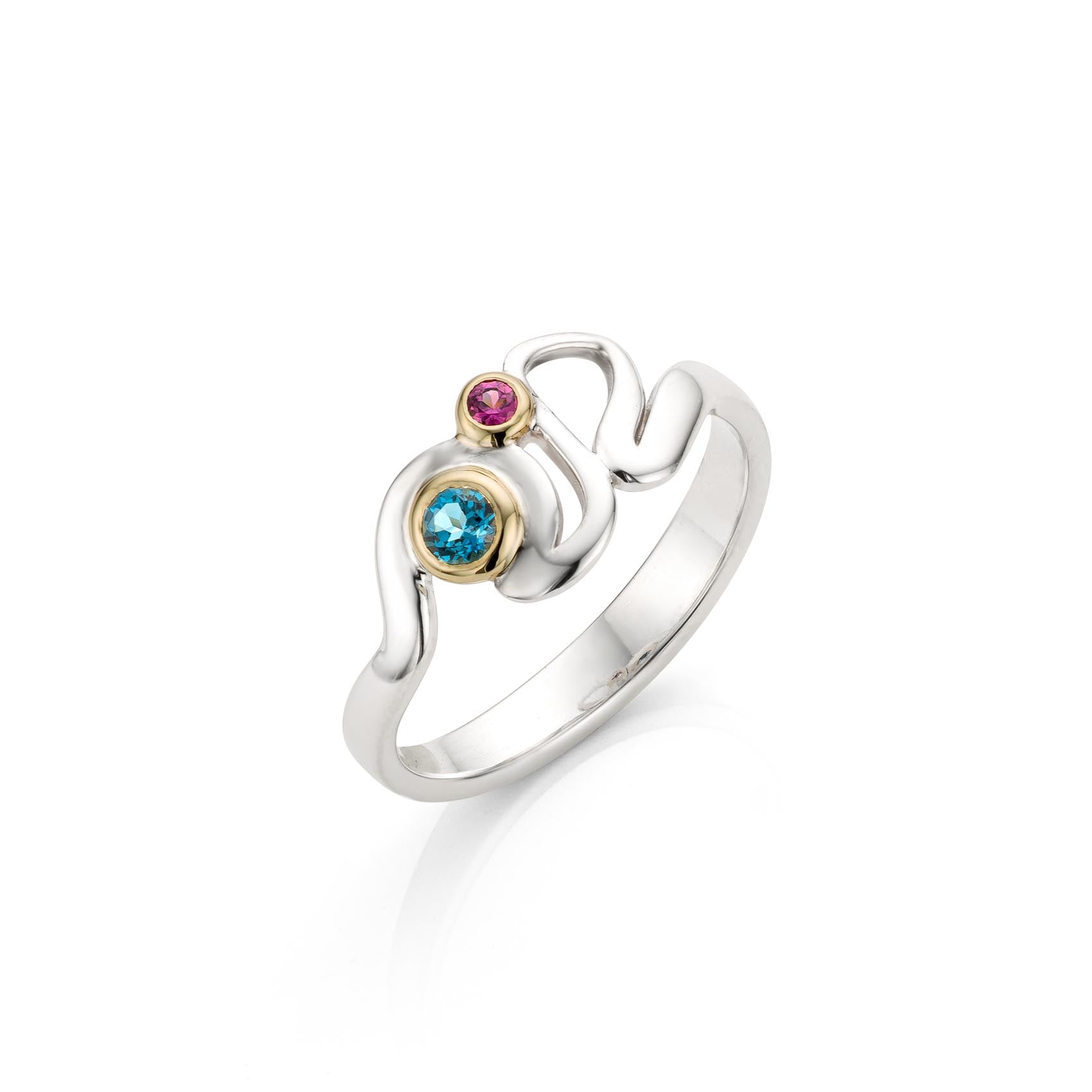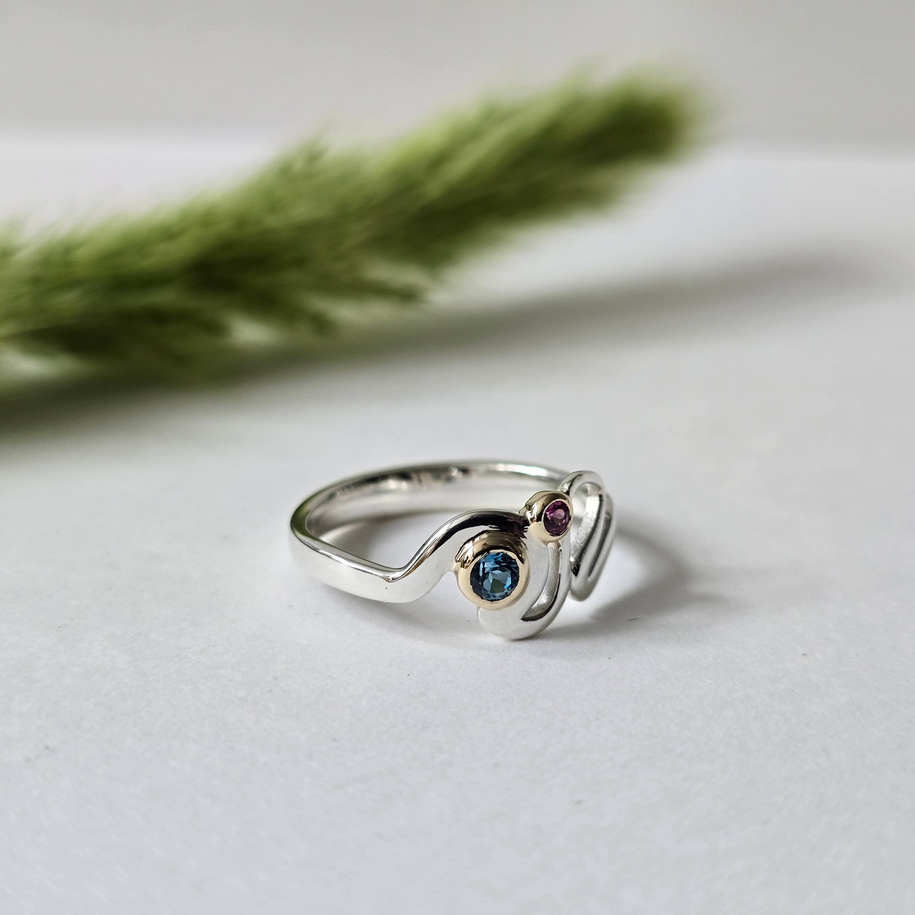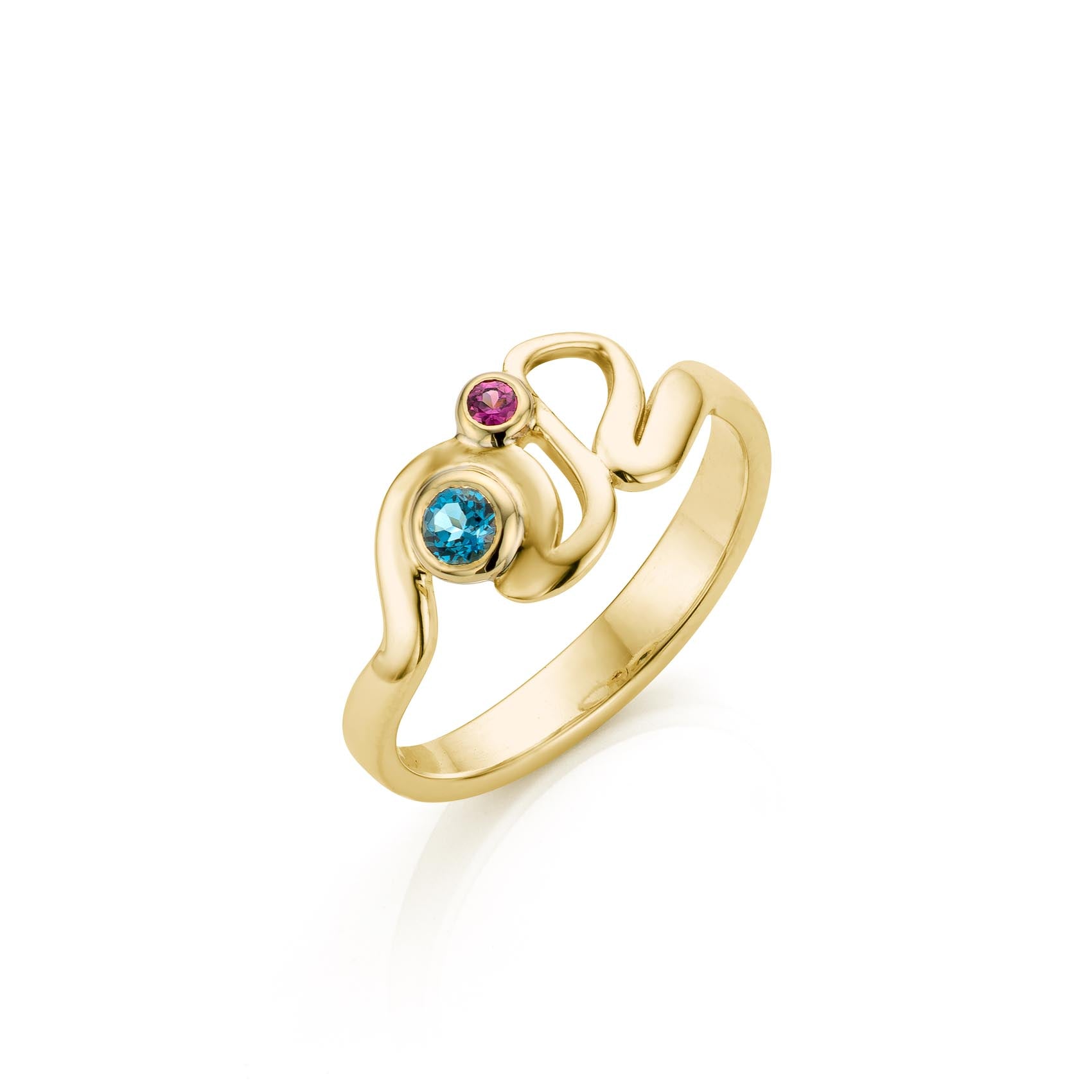 Twee kleine 14k geelgouden zetkastjes geven de ring een warme touch en dragen een diepe London Blue topaas en een sprankelende rhodoliet. Een stijlvolle combinatie van kleuren met een vleugje betekenis: helderheid, liefde en een tikje mysterie.